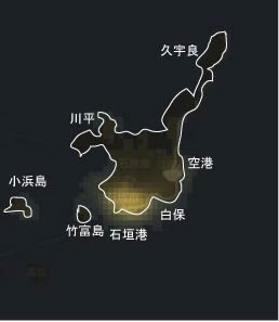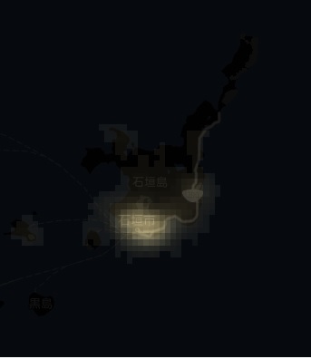 これだと光害がどこで多いかよくわかります。意外にも川平湾や小浜島や竹富島でも多少影響が出ている事に驚きです。石垣島の上に細長く伸びているのが平久保半島になります。